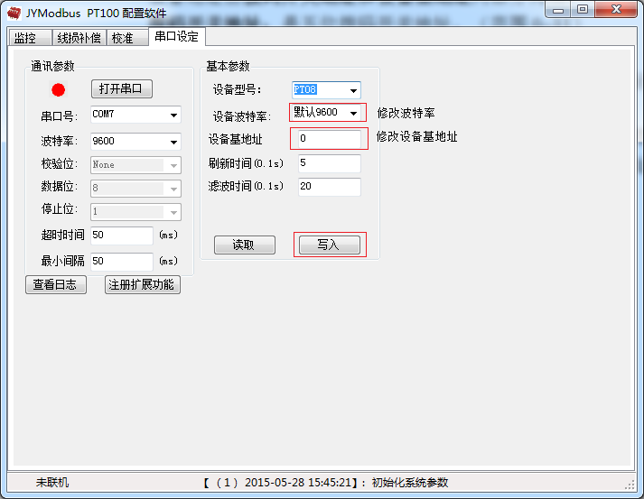打開采集配置軟件,選擇串口設(shè)定菜單,在通訊參數(shù)中點擊關(guān)閉串口,選擇相應(yīng)的串口號和波特率(默認(rèn)9600),超時時間和最小間隔都改成50ms。基本參數(shù)中設(shè)備型號選擇PT08。點擊打開串口 ,點擊 讀取 按鈕,在下邊信息欄中顯示讀取成功,則表示聯(lián)機成功,(若顯示通信失敗,請確定串口接線,串口號,波特率和地址是否正確)。