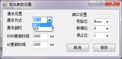 ②、根據當前設備選擇串口或TCP通訊方式,點擊保存,(注:TCP通訊方式下,僅設備的工作模式為TCP Server,即設備作為Server端)