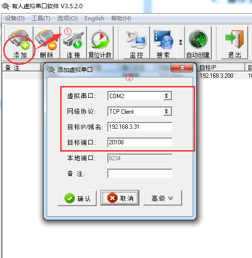 注:添加的虛擬串口不能與本機(jī)已有的串口沖突,目標(biāo)IP即設(shè)備的IP,虛擬串口參數(shù)要求與章節(jié)4中配置的設(shè)備參數(shù)一致。