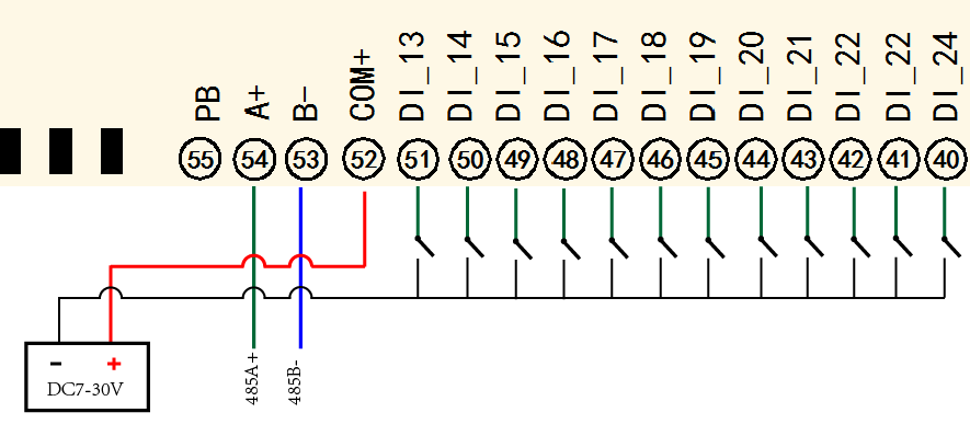 電腦自帶的串口一般是RS232,需要配232-485轉換器(工業環境建議使用有源帶隔離的轉換器),轉換后RS485為A、B兩線,A接板上A端子,B接板上B端子,485屏蔽可以接GND。若設備比較多建議采用雙絞屏蔽線,采用鏈型網絡結構。