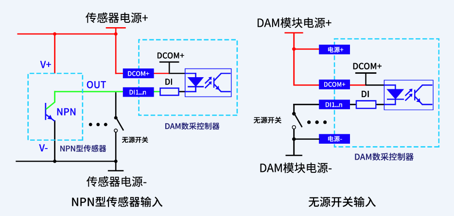 下圖中的電源部分為傳感器供電,AI1-AI8接傳感器信號正,ACOM-為傳感器信號負,ACOM+不用。