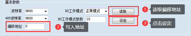 點擊JYDAM調試軟件下方偏移地址后邊的“讀取”或“設置”來對設備的偏移地址進行讀取或設置。