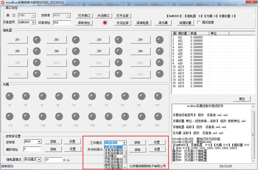 打開“聚英翱翔DAM調試軟件”點擊繼電器模式后面下拉箭頭進行模式的選擇。(后邊時間可自行設置,實際時間=填寫數字*0.1【單位秒】)