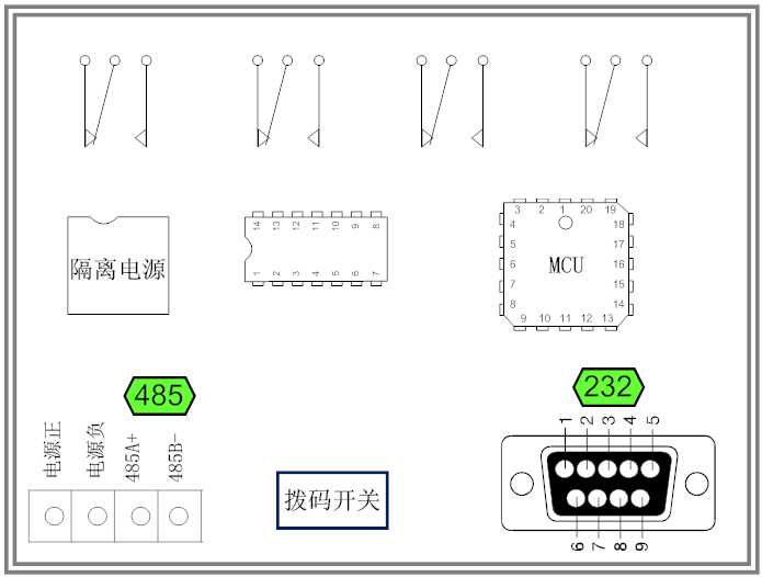 應用舉例及其說明:本機地址除了偏移地址地址之外,還有默認的254為廣播地址。當總線上只有一個設備時,無需關心撥碼開關地址,直接使用254地址即可,當總線上有多個設備時通過撥碼開關選擇為不同地址,發送控制指令時通過地址區別。
