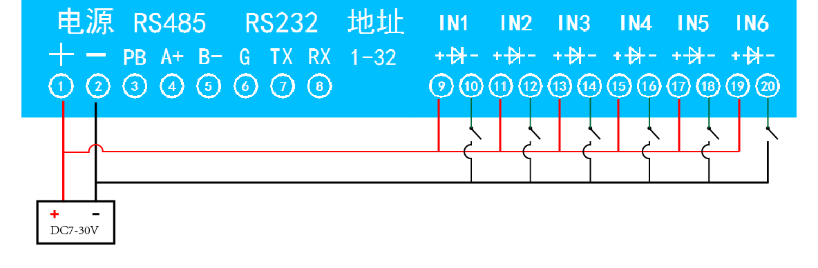 模塊本身帶有光耦輸入和繼電器輸出的板卡模塊,在該模式下,光耦每輸入一次信號(hào),對(duì)應(yīng)的繼電器會(huì)吸合,其他未輸入信號(hào)光耦對(duì)應(yīng)繼電器會(huì)斷開(kāi)。即: