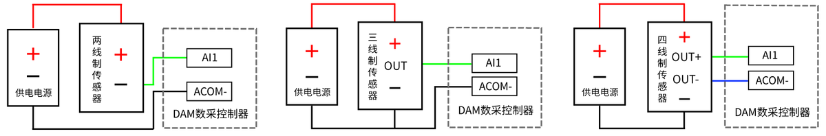 下圖中的電源部分為傳感器供電,AI1-AI8接傳感器信號(hào)正,ACOM-為傳感器信號(hào)負(fù),ACOM+不用。