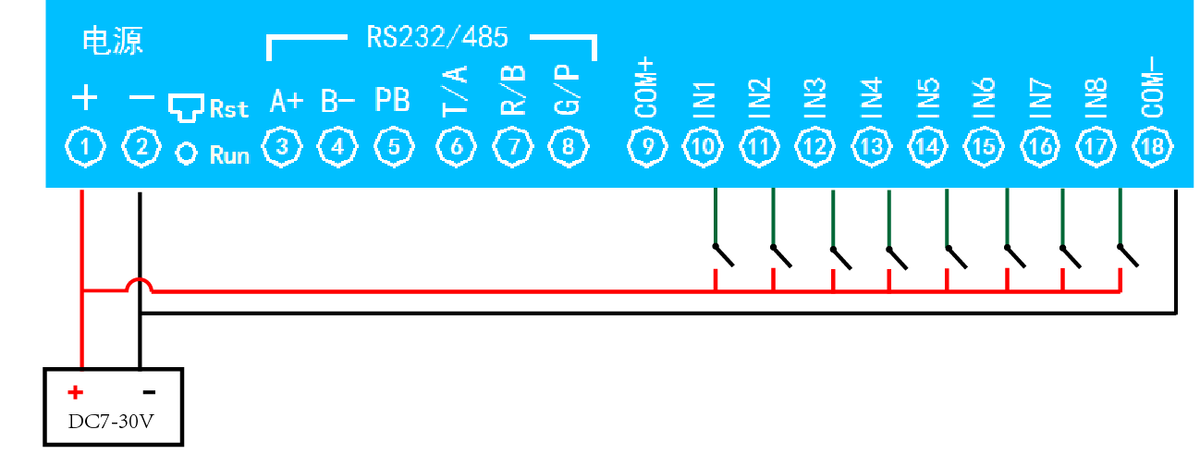電腦自帶的串口一般是RS232,需要配232-485轉換器(工業環境建議使用有源帶隔離的轉換器),轉換后RS485為A、B兩線,A接板上A端子,B接板上B端子,485屏蔽可以接GND。若設備比較多建議采用雙絞屏蔽線,采用鏈型網絡結構。