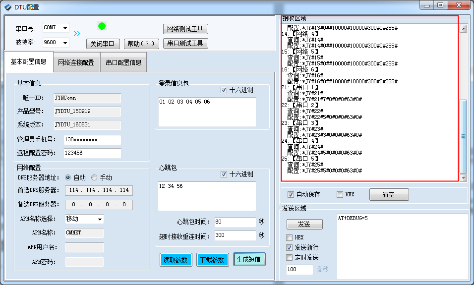 打開軟件后,打開串口,修改參數配置,點擊修改后,在DTU配置軟件的“基本配置信息”頁,點擊“生成短信”,即可生成短信指令。
